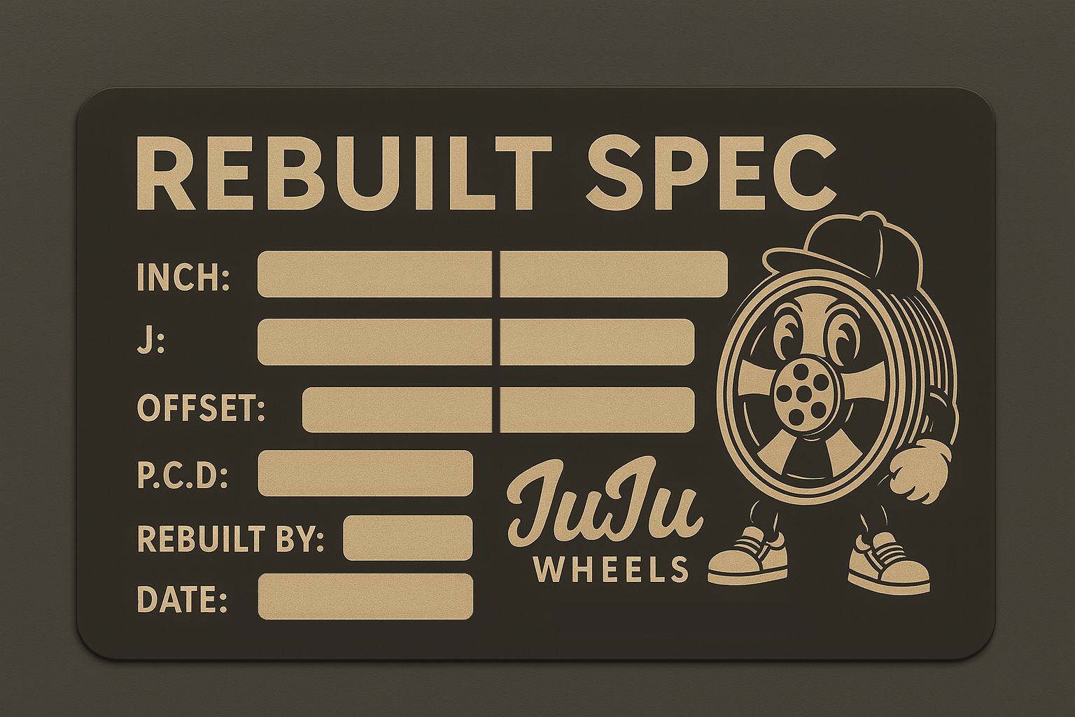 Keep your rebuilt wheels professionally documented with the Juju Wheels Rebuilt Spec Sticker Set.